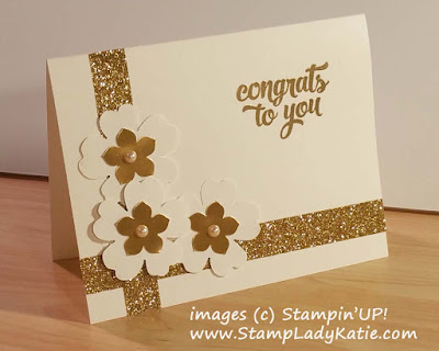 Its probably hard to tell from the photos, but I heat embossed the sentiment. And what to you think of the gold glitter tape? The glitter tape is one of this year's Sale-a-bration free choices. OMG I'm in love with this product. I so hope something like this makes it into the new catalog. Its wonderfully easy to work with. I made a bunch of these cards for a demo trade and it took no time at all.